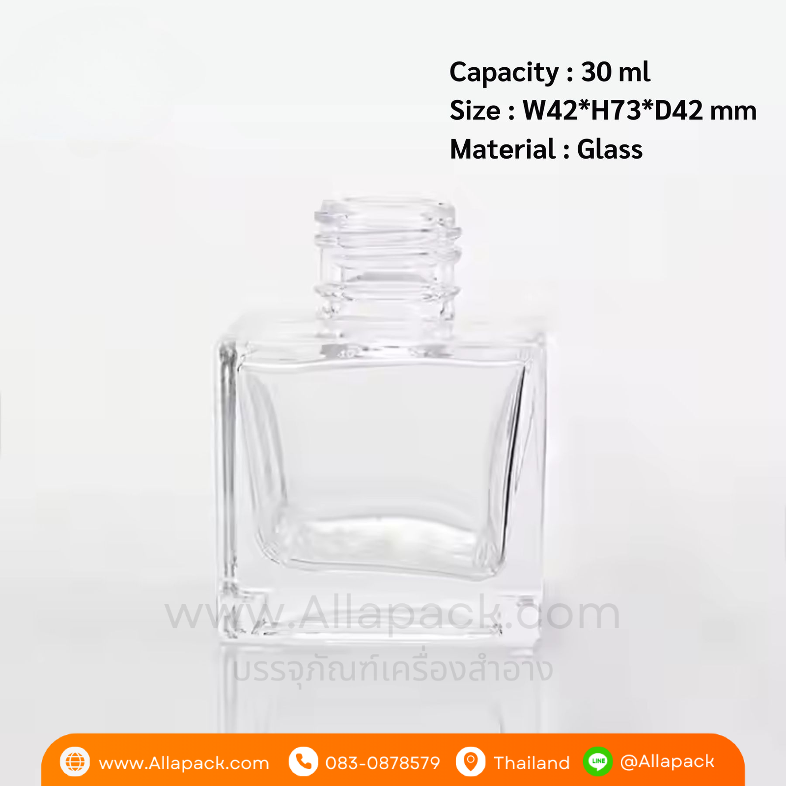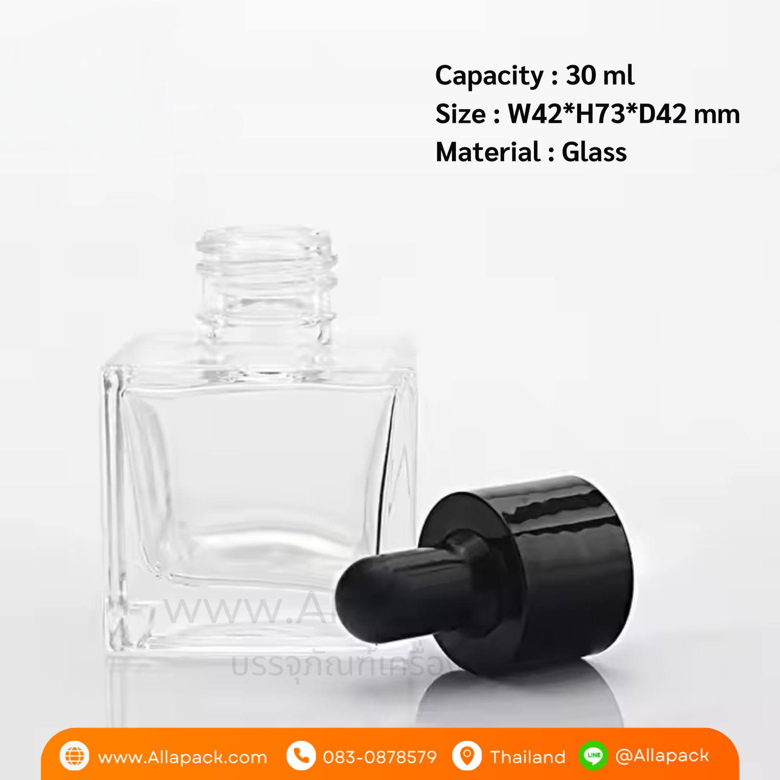 | Shape ลักษณะ | ขวดแก้วสี่เหลี่ยมใส พร้อมฝาดรอปเปอร์ |