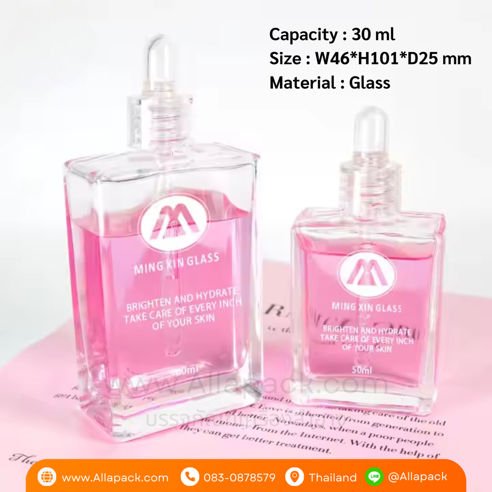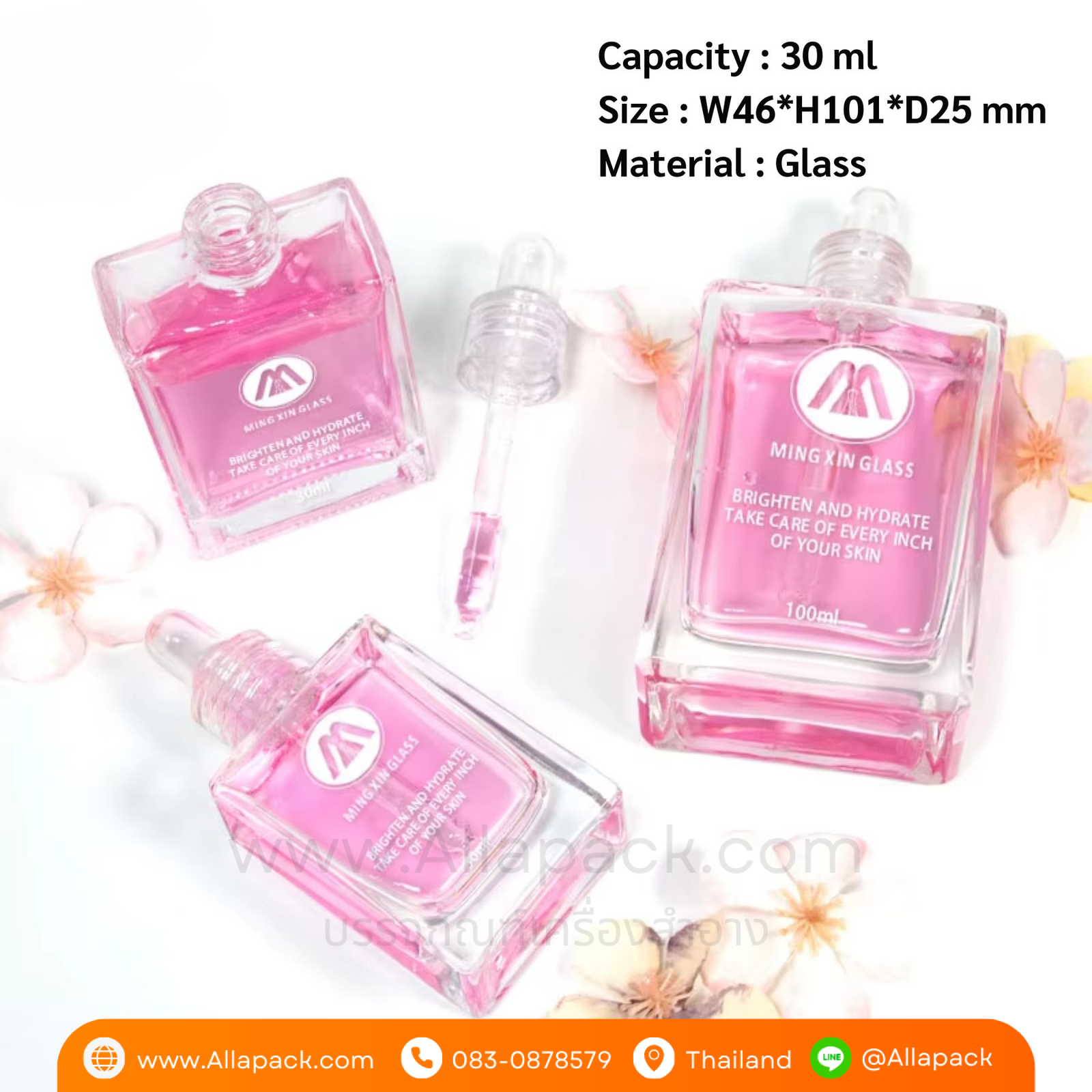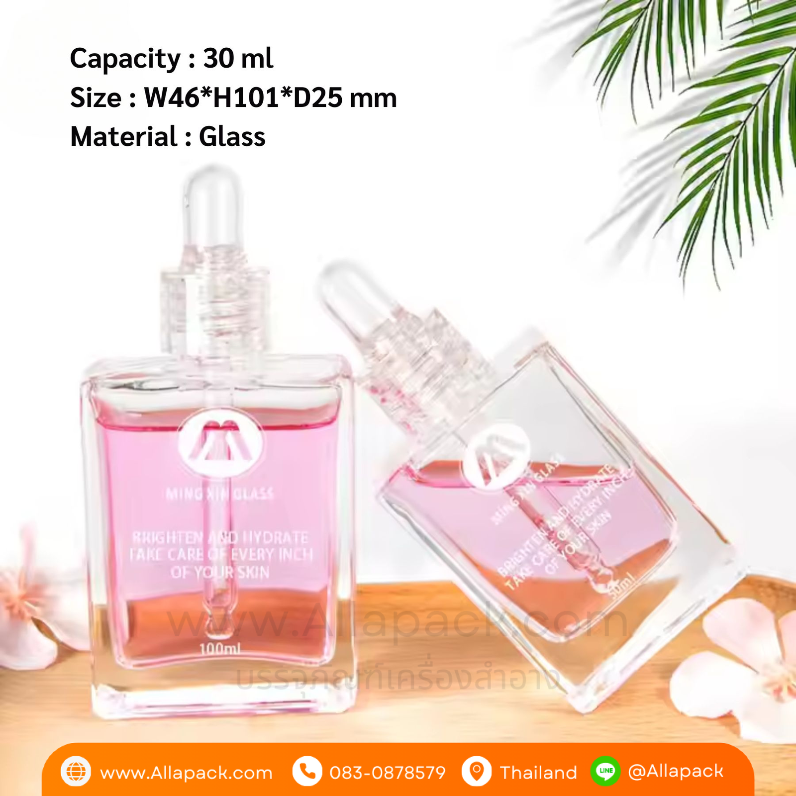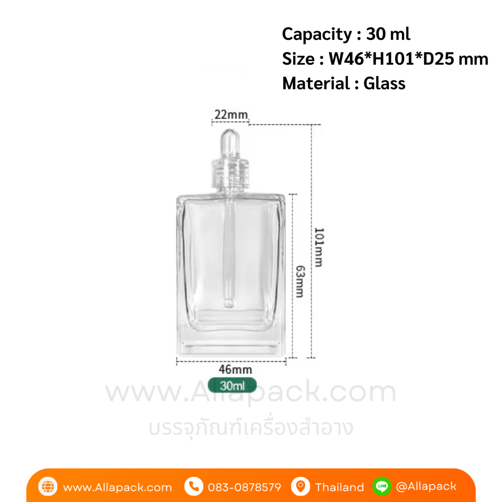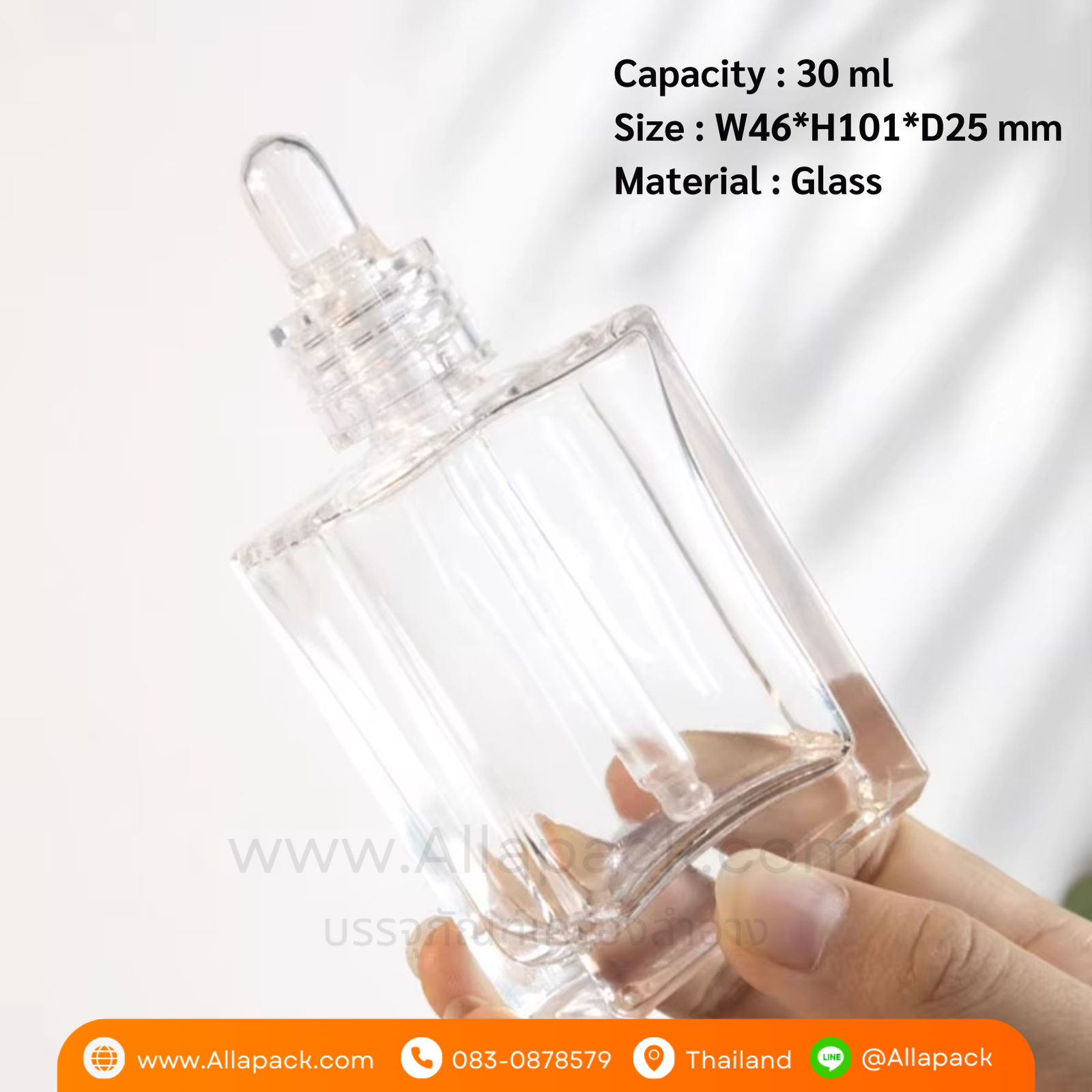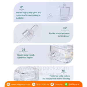 | Shape ลักษณะ | ขวดแก้วสี่เหลี่ยมใส พร้อมฝาดรอปเปอร์ใส |