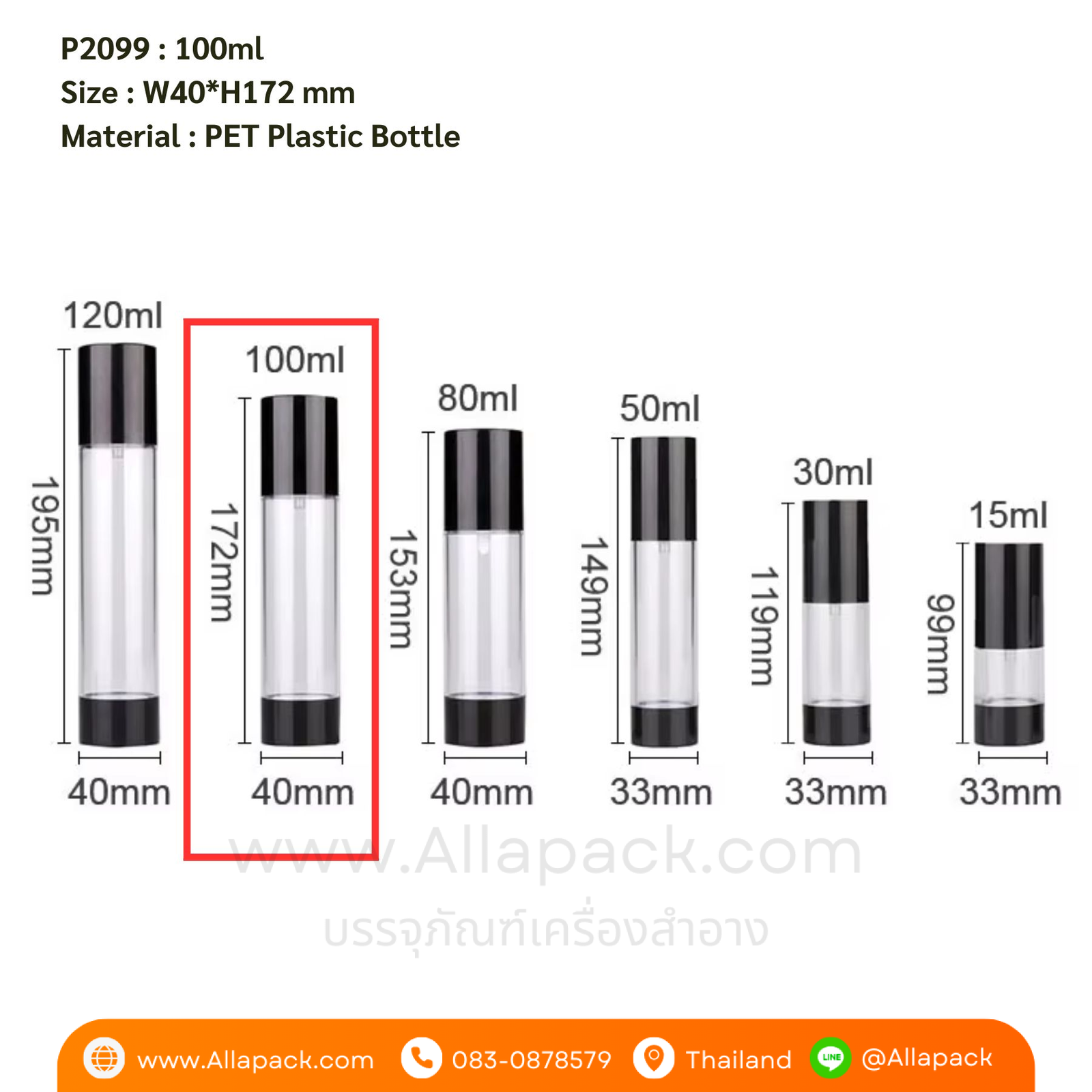 P2099 Airless Cosmetic Bottle 100ml ขวดปั๊มสุญญากาศสีดำ 100มล