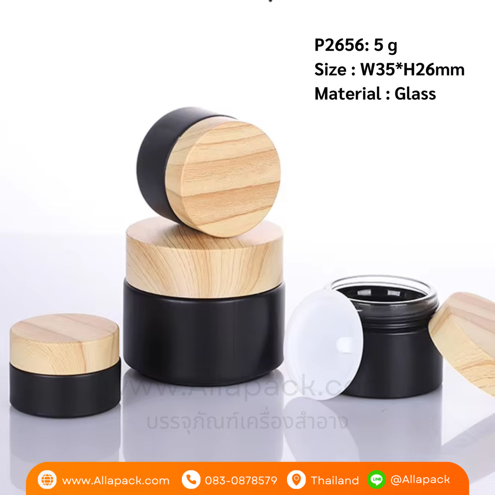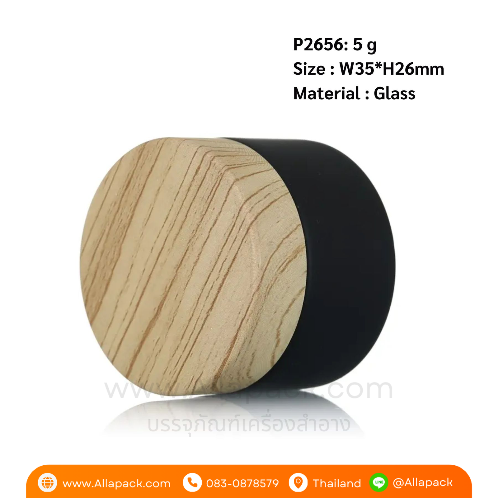 P2656 Matte Black Glass Jar 5 g with Plastic Bamboo Wooden Grain Lid กระปุกแก้วสีดำ 5 กรัมพร้อมฝาพลาสติกลายไม้