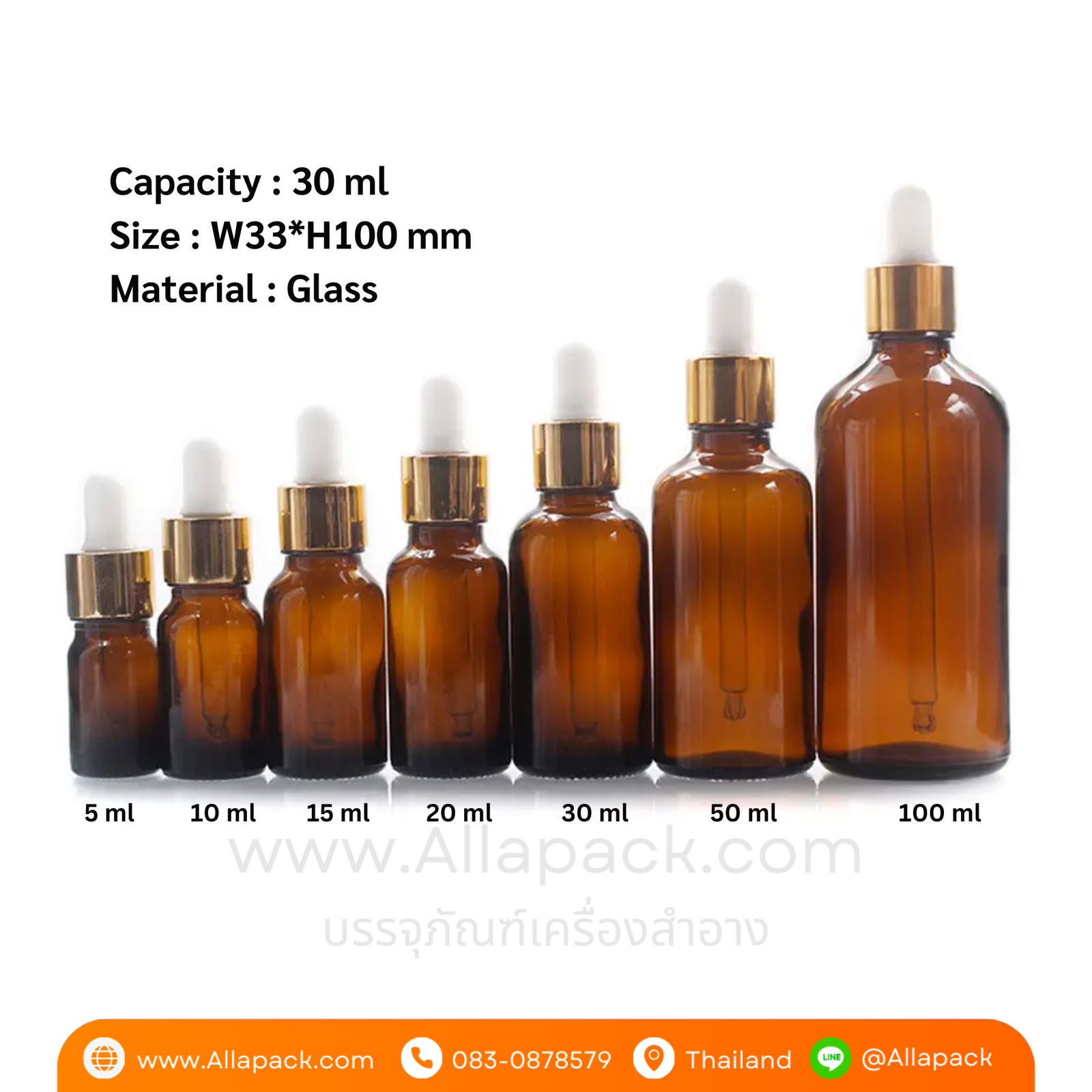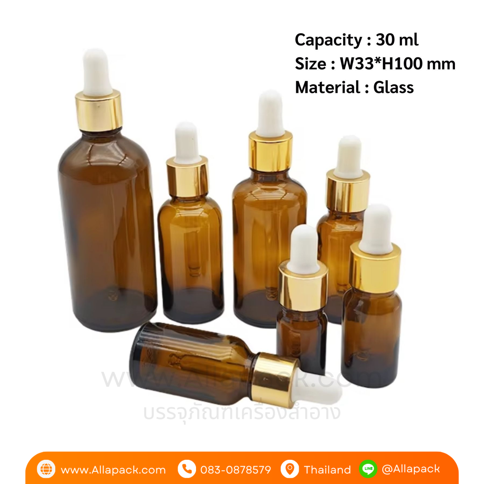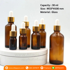 P948 Glass Amber Bottle 30 ml with Dropper ขวดแก้วสีชาดรอปเปอร์สีขาวทอง 30 มล