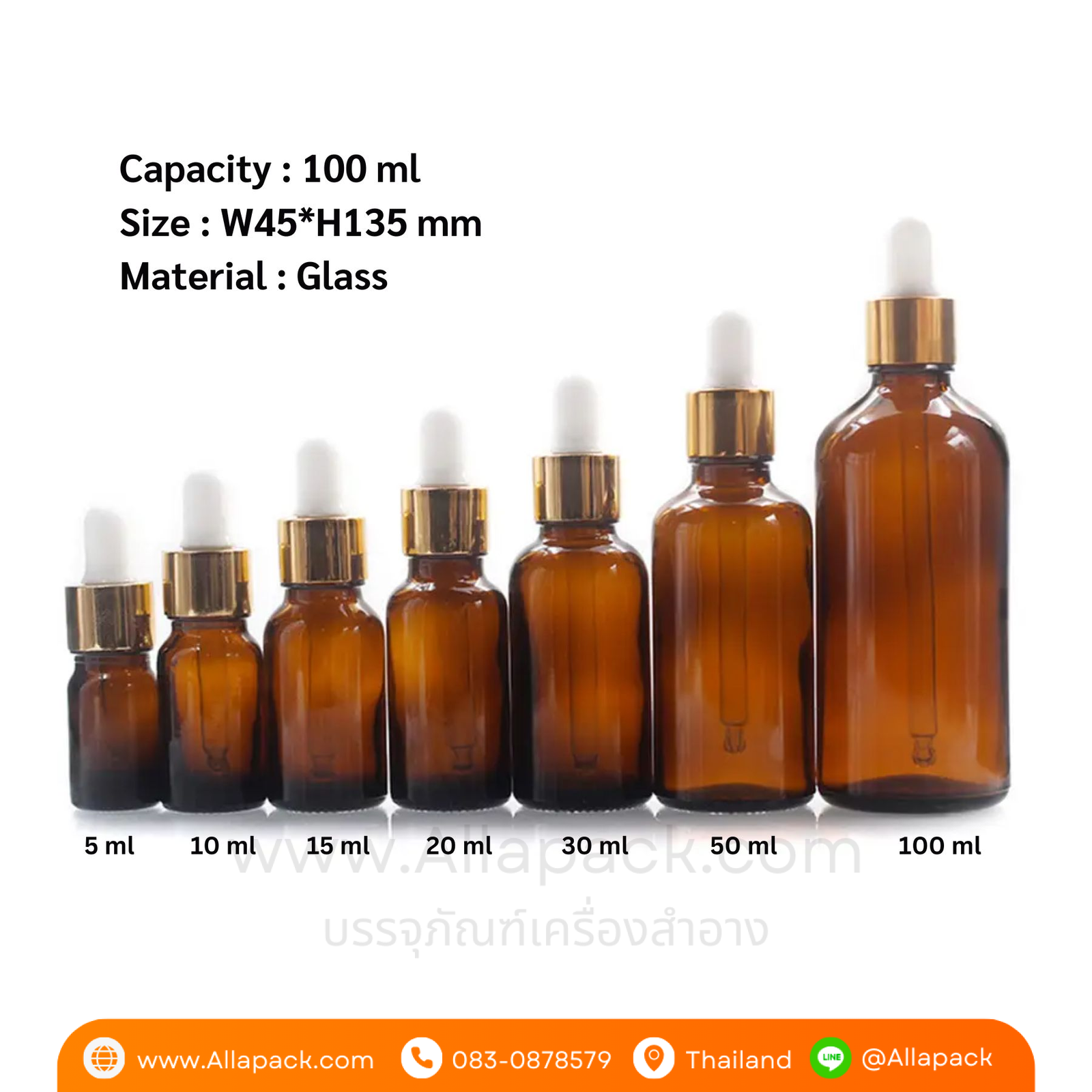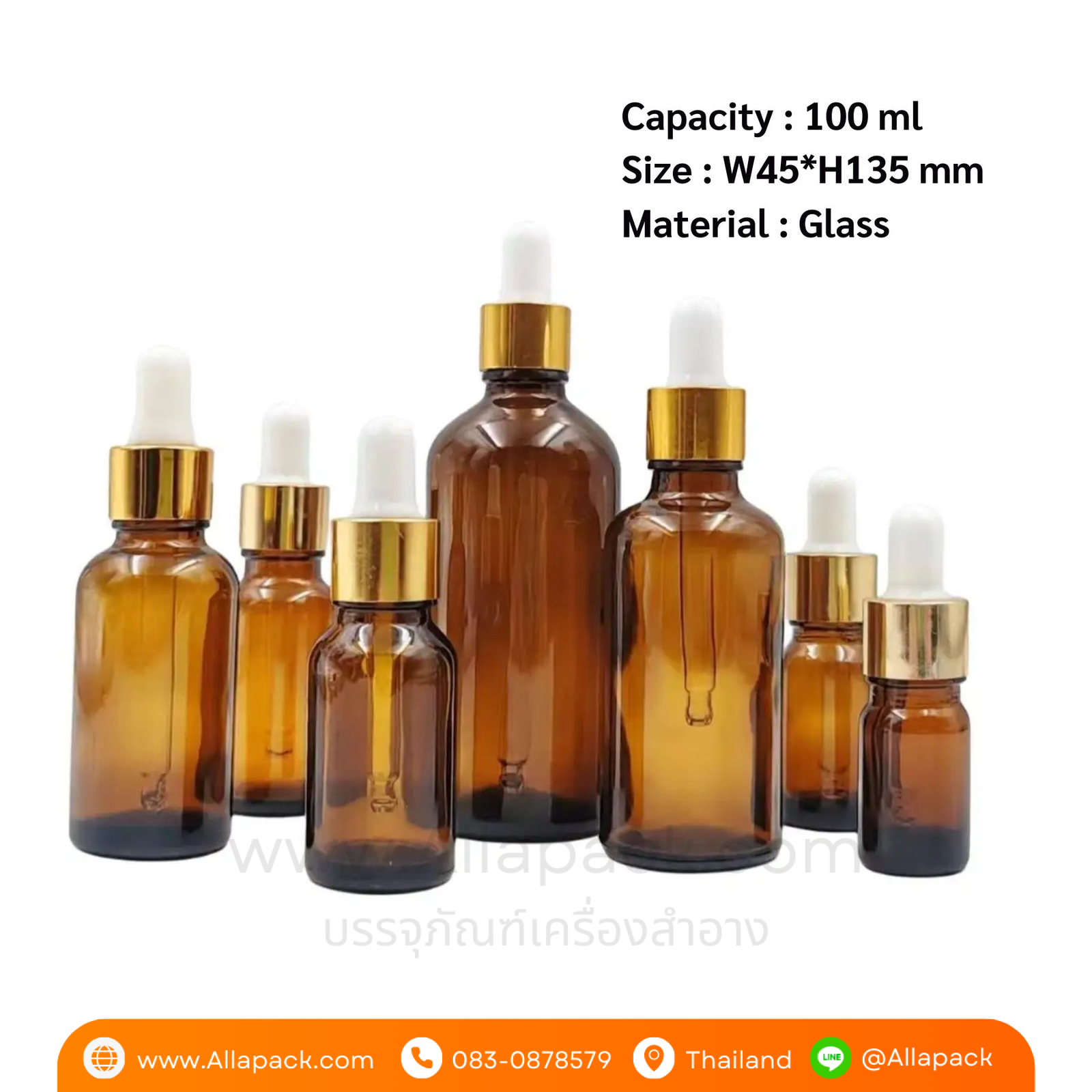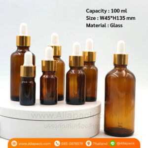 P950 Glass Amber Bottle 100 ml with Dropper ขวดแก้วสีชาดรอปเปอร์สีขาวทอง 100 มล