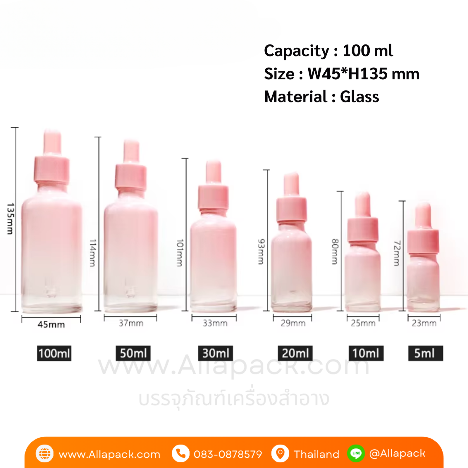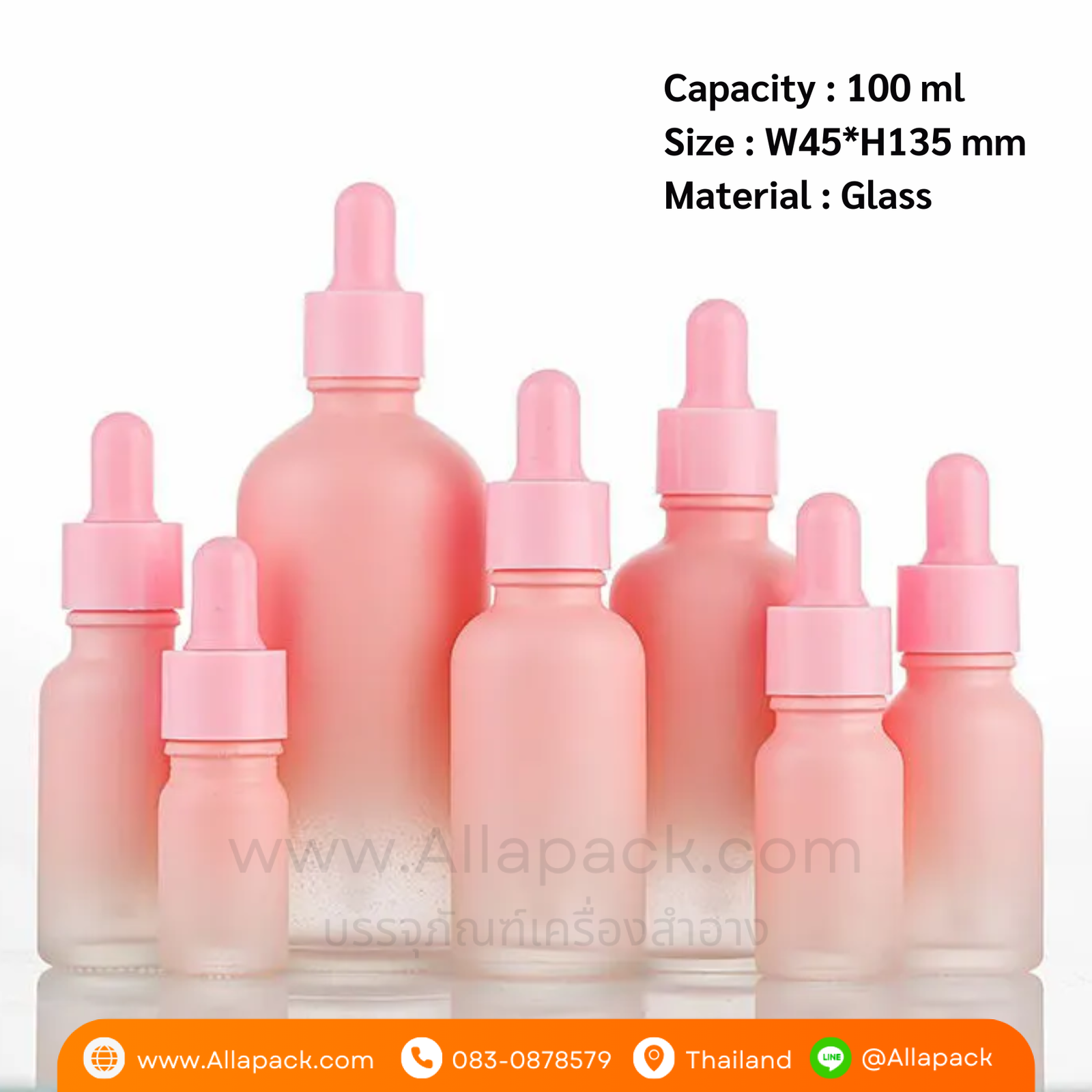 | Shape ลักษณะ | ขวดแก้วสีชมพู ฝาดรอปเปอร์สีชมพู |